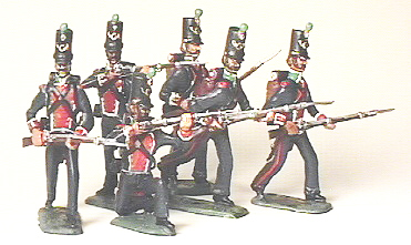 The uniform of the 4th Light Infantry consisted of indigo blue coat and trousers with green facings, red turnbacks and plasteron. They wore a very characteristic tall, stovepipe shako with a green ball plume.