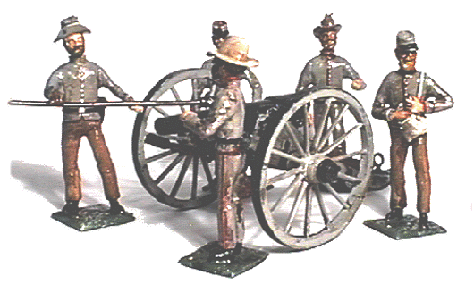 Confederate Gun crews were dressed in a combination of regulation gray and butternut. Articles of civilian clothing were common as were broad brimmed felt hats.