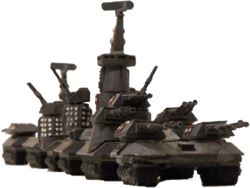 The UES Light Landship Eribus. The Eribus was typical of the crusier style landships of the UES. It was a five segment landship 290 feet long. It was armed with four turrets mounting three class 2 Rocket Assisted Rifles, one rocket turret with 8 class 2 guided missiles, six secondarys consisting of Skyrake turrets armed with twin barrel heavy AAA guns. One class 3 heavy laser was mounted in the command segment. There were two screen generators of 100 points value each. Its target classification is Light Landship. Its base move is 15".