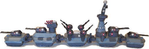 The PRC Landship Red Lantern was over 300 feet long, having five segments, two class 2 rocket assisted rifles mounted in the forward segment, three gun turrets each mounting three class 3 rocket assisted rifles, one gun turret with twin rocket assisted rifles and a rocket mount with 8 class 2 guided missiles, a guided missile casemate with 24 class 3 guided missiles, 1 4 barreled medium flack gun, 2 medium laser projectors,2 secondary turrets each with a twin barreled heavy AAA gun and 2 screen generators of 100 points each. Its target classification is medium landship and its base move is 10"