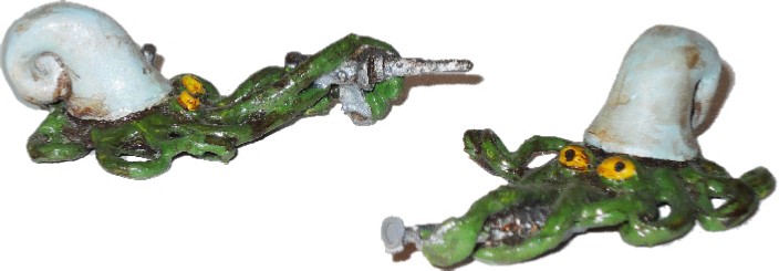 Nautaloids are apparently telepathic among their own kind. When communicating with other races they use a device very similar to a Ralnai Voder Box. Despite their clumsy appearance out of water, the Nautaloids can move with considerable agility over almost any type of terrain. They do, however tend to dry out rather rapidly. (During the battle for Rhoads Mine ,several Nautaloids were observed dousing themselves with water from a portable tank.) They seem to prefer wet swampy areas and can be very difficult to eradicate from that type terrain. As long as they can stay wet, temperatures up to 100° f. don’t seem to bother them much. On the other hand, extreme cold seems to have little effect other than to slow their movements slightly. Before the Federation survey station on Icebox was over run by the Nautaloids, the giant cephalopods were reported frolicking amid the ice flows and sliding on their shells amid the glaciers.