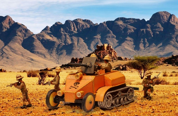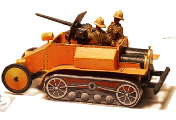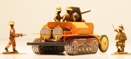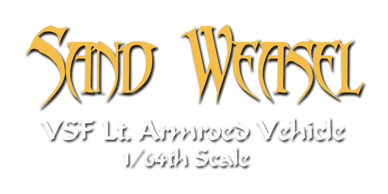 The Sand Weasel by Reviresco is scaled for 28mm 1/64 scale figures and measues 3 x 1.4 x 1.8 inches and comes with a fold up paper 3lb quick fire gun. The troops shown in these photos are sold separately .
