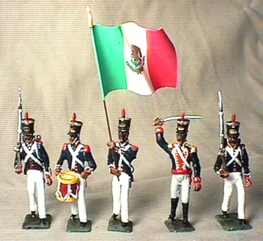 These troops are wearing the old style single breasted uniform with an unusual carrot plume on the shako. They are wearing the summer white trousers and are typical of the Mexican troops assaulting the Alamo.