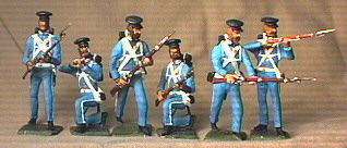 Troops wearing this uniform of powder blue with white crossbelts and dark blue hats served in all the battles of the U.S. Mexican War. This uniform was worn along the western frontier and in isolated posts until the late 1850's.